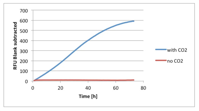 在測量室中保持溫度為37℃,CO2濃度為5%,用Varisikan Lux儀器每小時測一次熒光(激發波長560nm,發射波長590nm,底讀),測72小時。 同時進行未控制CO2水平的實驗作為對照。