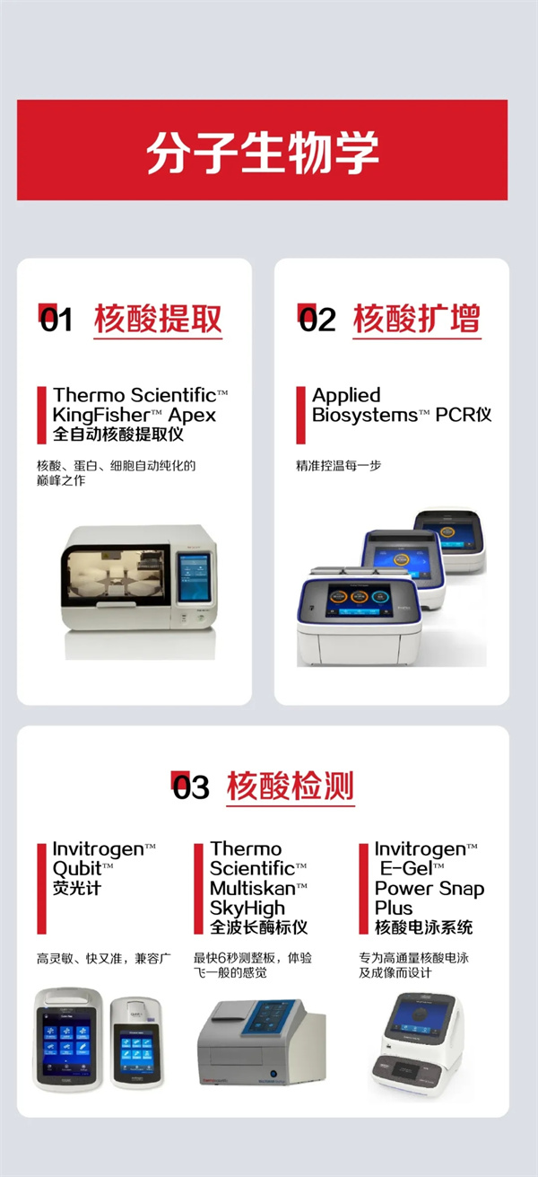 賽默飛旗下的Invitrogen、 Gibco、Thermo Scientific、Applied Biosystems子品牌可提供一系列高性能、高配置、高通量的科學儀器設備,為高校、科研院所、政府機構、醫院以及生物制藥企業提供全方位、全流程、全領域的完整解決方案。